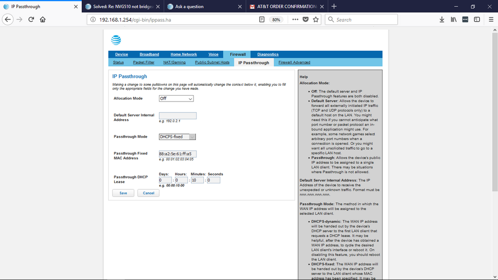 Bgw210 Ip Passthrough Mode Enabled At T Community Forums