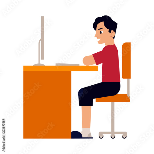 Flat Cartoon Teen Boy At Computer Desk Royalty Free Vector