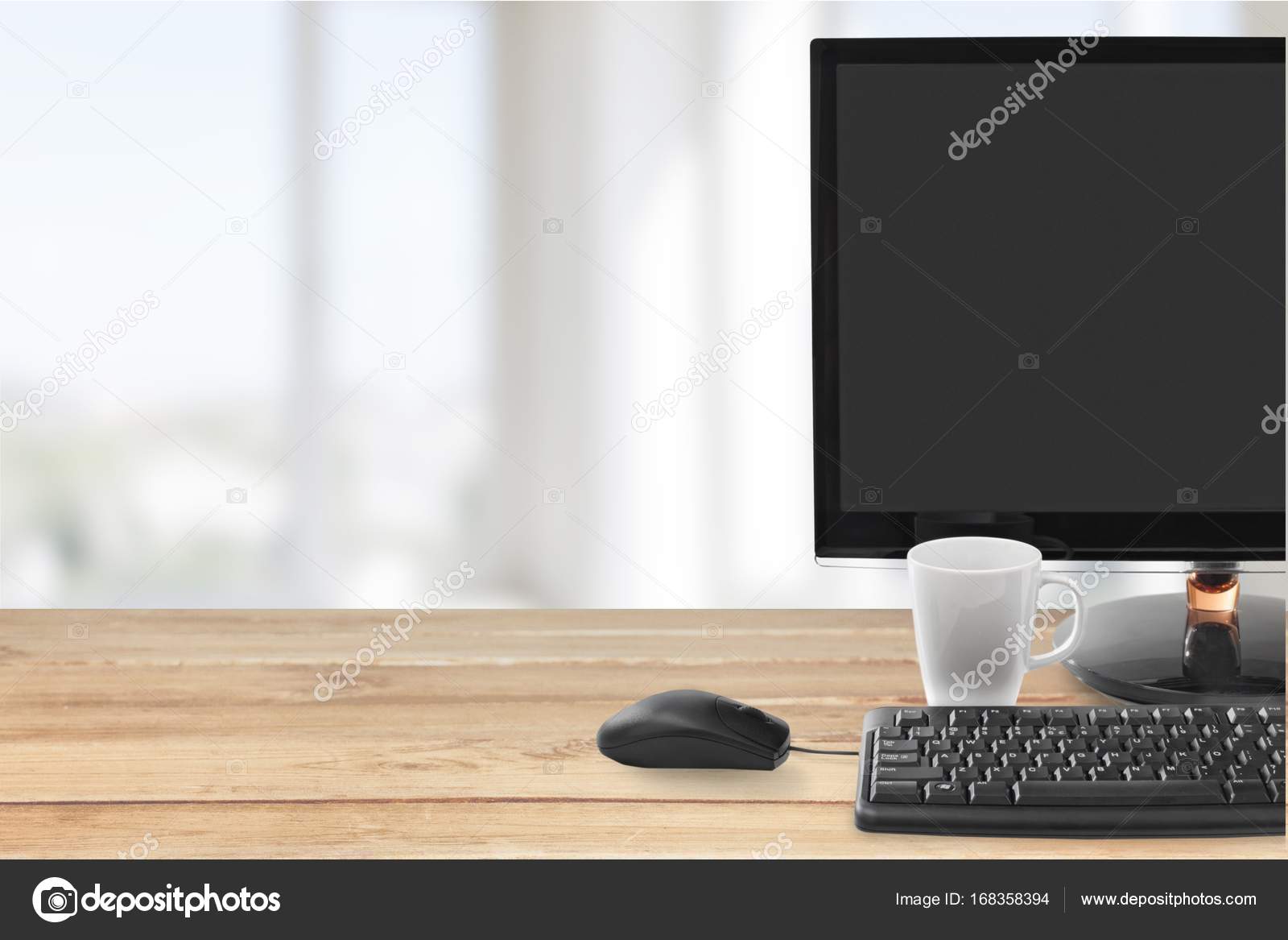 Computer Screen Cup Coffee Table Background Stock Photo