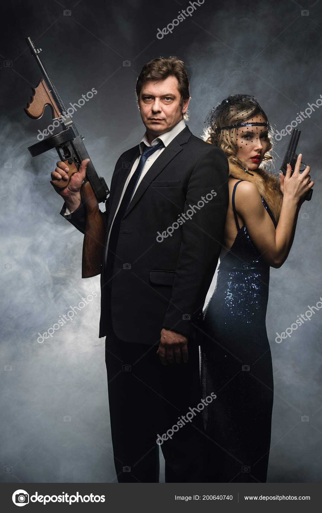 Pair Gangsters Man Woman Guns Black Background Smoke Stock Photo