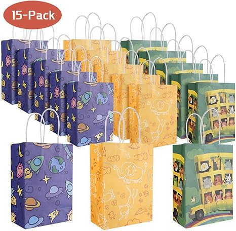 Amazon Com Asmotim Party Favor Bags Kids Small Paper Gift Bags 15 Pack Recyclable Paper Goodie Bags With Handles Treat Snack Paper Bags For Toddler S Birthday Party Decoration 8 26 5 9 3 14 3 Patterns Kitchen