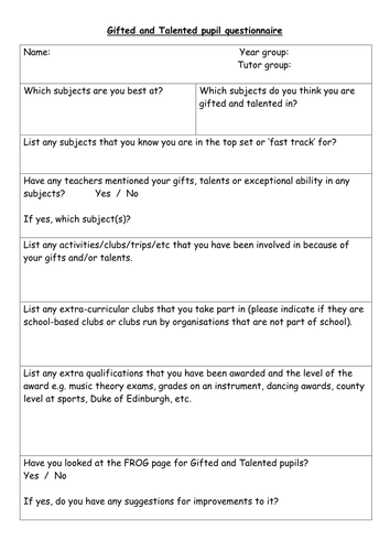 Ks3 Gifted And Talented Questionnaire Teaching Resources
